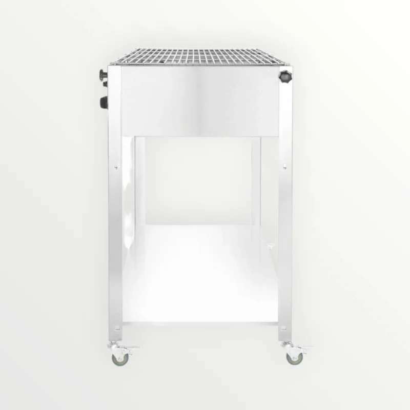 Das Gehäuse aus Edelstahl AISI 430 ist langlebig und pflegeleicht. Dank Rädern lässt sich der Grill bequem bewegen, die zwei Abtropfschalen erleichtern die Reinigung. Geliefert wird mit Gasschlauch & Druckminderer (50 mbar) – anschließen, aufheizen, losgrillen.